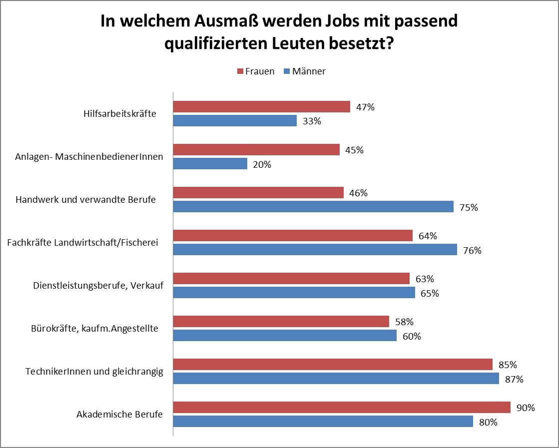 Mit einem mittleren Abschluss finden Frauen häufiger als Männer eine Beschäftigung entsprechend ihrem Ausbildungsniveau. So finden sich Absolventinnen einer Berufsbildenden Mittleren Schule (BMS) nur zu 9 % in einer Tätigkeit unter ihrer formalen Qualifikation, während das für 20 % der Absolventen der Fall ist. Auch Frauen mit Lehrabschluss werden deutlich weniger oft unter ihrem Ausbildungsniveau eingesetzt (17 % vs. Männer 24 %). Dieser Befund ist jedoch mit Vorsicht zu genießen: Frauen haben nur etwa halb so oft einen Lehrabschluss und sind aufgrund der geschlechterstereotypen Lehrstellenwahl sehr stark in den Dienstleistungsberufen Einzelhandel, Friseurin, Gastronomie zu finden. Eine Tätigkeit, die ein höheres Ausbildungsniveau erfordert, geht bei Frauen daher nicht automatisch mit einem höheren Entgelt einher: So verdienen Frauen, die einen Lehrabschluss haben und in ihrem Beruf arbeiten, wie etwa eine ausgebildete Einzelhandelskauffrau, 9,50 Euro brutto in der Stunde, während ein un- oder angelernter Hilfsarbeiter durchschnittlich einen Stundenlohn von 10,30 Euro erhält (Statistik Austria, Verdienststrukturerhebung 2010).
