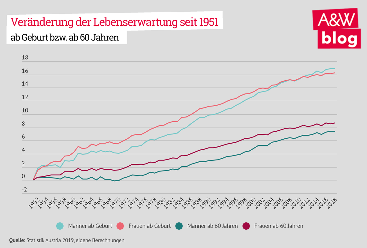 Für Alterssicherungssysteme ist allerdings die Entwicklung der ferneren Lebenserwartung – z. B. im Alter von 60 Jahren – wesentlich relevanter, weil diese einen wichtigen Einflussfaktor für die durchschnittliche Pensionsbezugsdauer darstellt. Die fernere Lebenserwartung der Männer im Alter von 60 Jahren blieb von 1951 bis etwa 1970 weitgehend unverändert, jene der Frauen erhöhte sich in diesem Zeitraum nur moderat (um 1,5 Jahre). Seit 1970 ist demgegenüber sowohl bei Frauen als auch bei Männern ein Zuwachs um gut sieben Jahre zu verzeichnen.