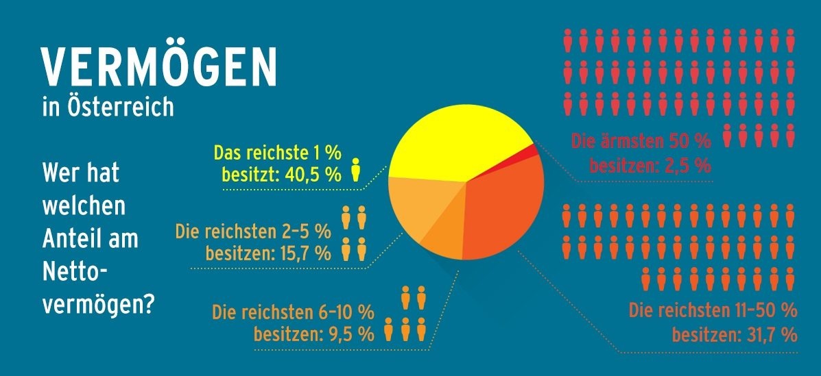 Zu Jahresbeginn veröffentlichte die Oesterreichische Nationalbank (OeNB) neue Daten zur Vermögensverteilung in Österreich. Besonders reiche Haushalte sind darin allerdings nur unzureichend erfasst, womit die tatsächliche Vermögenskonzentration noch größer ist als die in den Daten gemessene. Versucht man diese Untererfassung an der Spitze zu berücksichtigen, so ergibt sich für das reichste 1% der Haushalte ein Vermögen von 534 Mrd. Euro. Das entspricht einem Anteil von 41% des Gesamtvermögens – und damit mehr als das 16-fache der ärmeren Hälfte der Bevölkerung.