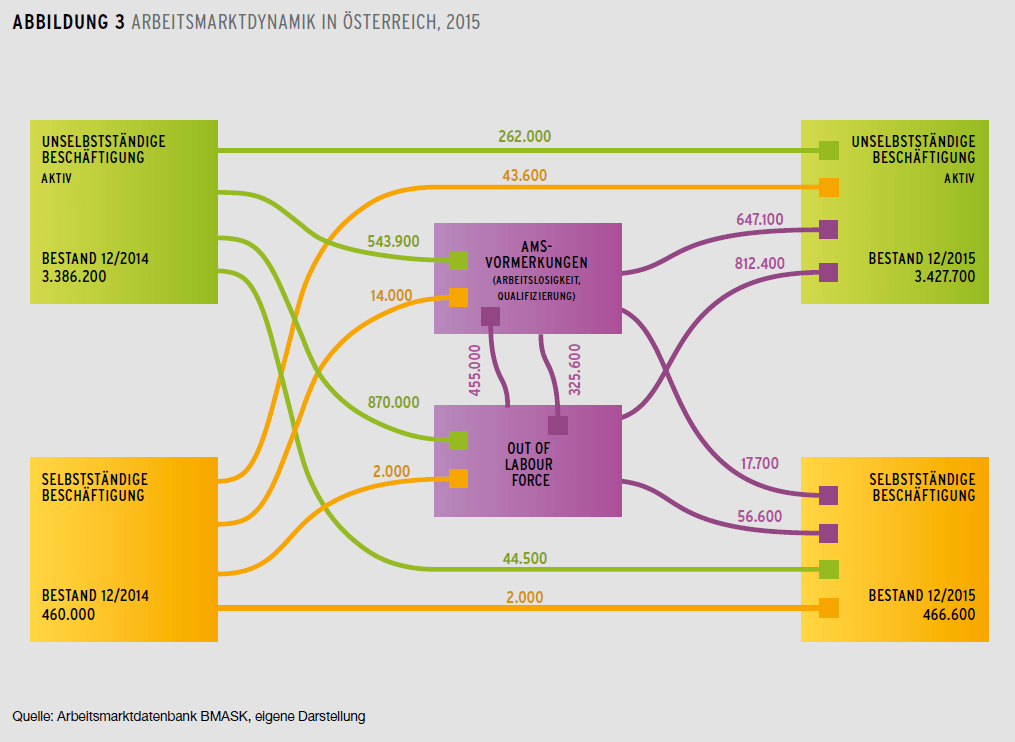 Österreich ist ein dynamischer Arbeitsmarkt. Es kommt zu vielen Beschäftigungsaufnahmen aber auch –beendigungen. Wie Abbildung 3 zeigt, wurden im Jahr 2015 in Summe knapp 1,8 Mio. unselbständige Beschäftigungsverhältnisse aufgenommen (die Summe der Pfeile, die in den oberen rechten Kasten führen). Davon kamen 15% aus einer anderen unselbstständigen Beschäftigung und 46% aus „Out of Labour Force“ (d.h. die Personen hatten eine „erwerbsferne Position“, bspw. Karenz oder eine Ausbildung). Rund 647.000 Beschäftigungsaufnahmen (37%) kamen von Personen, die zuvor beim AMS arbeitslos vorgemerkt waren. Betrachtet man die Wechsel in Arbeitslosigkeit, so sind etwas mehr als die Hälfte (543.900) Personen aus einer unselbstständigen Beschäftigung in Arbeitslosigkeit gewechselt, etwas weniger Personen (455.000) kamen aus einer erwerbsfernen Position. Eine gute Nachricht ist, dass es mehr Wechsel aus Arbeitslosigkeit in Beschäftigung gibt als umgekehrt.