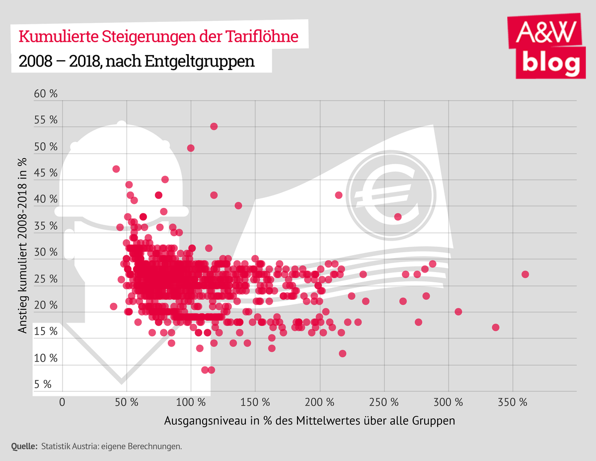 In Österreich gilt für rund 95–98 % aller unselbständig Beschäftigten ein Kollektivvertrag. Die außerordentlich hohe tarifvertragliche Deckungsrate ermöglicht den Gewerkschaften, direkt Einfluss auf die Mindestentgelte bei fast allen Beschäftigtengruppen zu nehmen. In Ländern ohne flächendeckende und branchenweite Tarifverträge können über gesetzliche Mindestlöhne ausschließlich die am geringsten entlohnten Beschäftigtengruppen erreicht werden. Beträchtliche Lohnunterschiede innerhalb und zwischen den Wirtschaftsbranchen galten als charakteristisch für den österreichischen Arbeitsmarkt, wie Mesch 2004 oder Leoni/Pollan 2011 feststellten. Dieser Entwicklungsbefund scheint sich aber den jüngsten Daten zufolge abzuschwächen; so weist Österreich nach der neuesten Arbeitskostenstudie von EUROSTAT vergleichsweise geringe Lohnunterschiede zwischen den Branchen auf. Im Ländervergleich der EU-28 liegt die mittlere Streuung der Arbeitskosten über alle Wirtschaftsbranchen in Österreich unter dem Wert für den gesamten Euro-Raum. Nur in den skandinavischen Ländern, Belgien, den Niederlanden, Slowenien und Frankreich sind die Lohnunterschiede zwischen den Branchen niedriger.