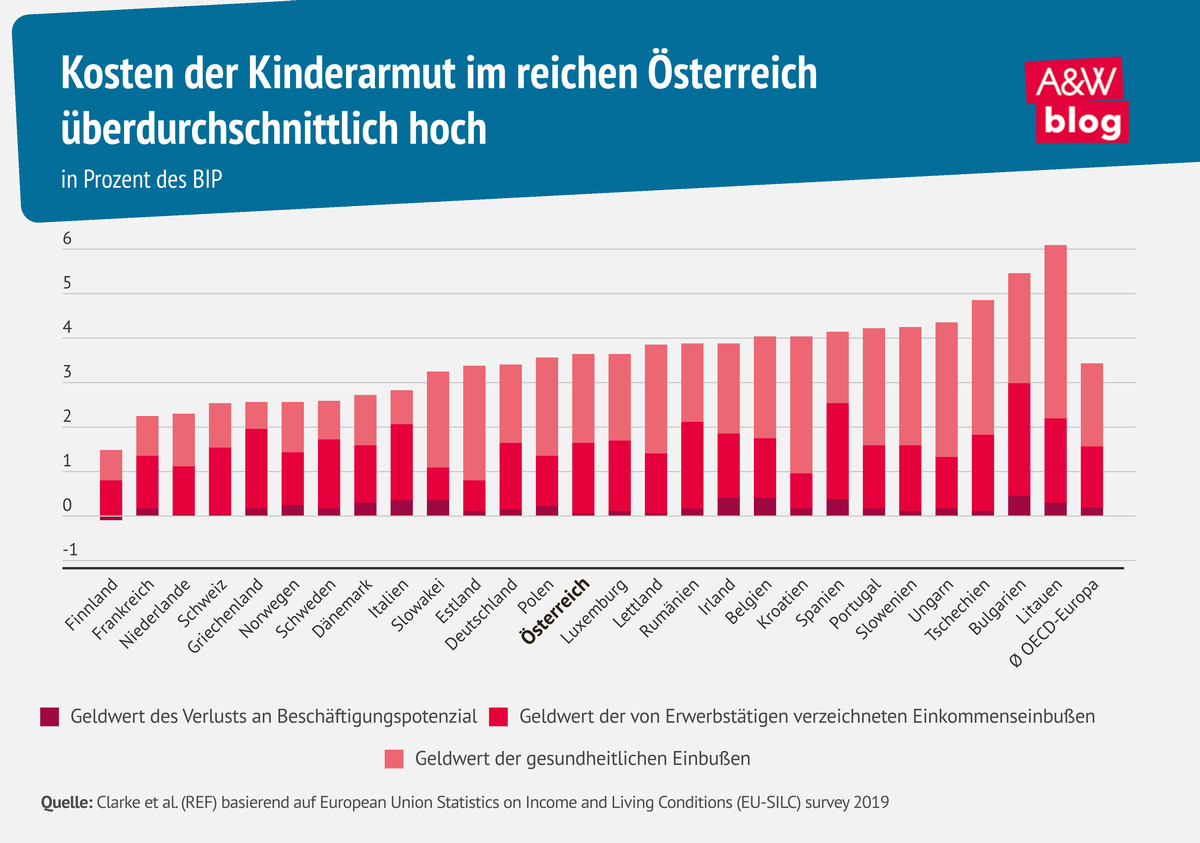 Die jährlichen Kosten der Kinderarmut betragen in Österreich in Summe also 3,6 % des BIP und liegen damit über dem OECD-Durchschnitt (siehe Grafik); und das, obwohl Österreich eines der reichsten Länder ist.