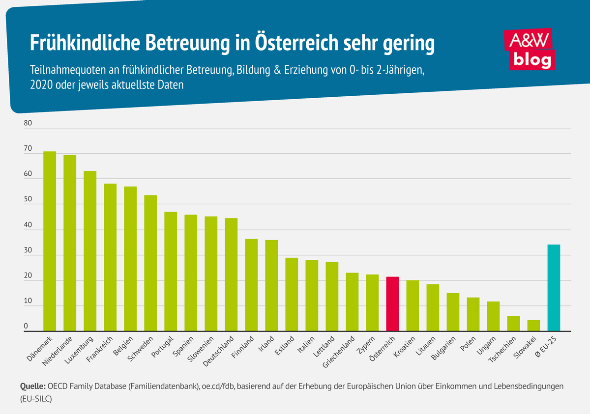 Ein Vergleich der europäischen OECD-Länder zeigt jedoch, dass die Teilnahmequoten an frühkindlicher Bildung, Betreuung und Erziehung der unter Dreijährigen in Österreich niedrig sind (siehe Grafik). Dafür gibt es gleich mehrere Erklärungen: Neben großzügigen Kinderbetreuungsgeld- und Elternkarenzregelungen, die es attraktiv machen, Kinder zu Hause zu betreuen, führen Angebotsengpässe und unflexible Öffnungszeiten bei den Bildungsangeboten zu geringer Inanspruchnahme. Deutlich macht das auch ein Blick auf die Investitionen in frühkindliche Bildung, Betreuung und Erziehung: Trotz der jüngsten Erhöhungen betragen die öffentlichen Ausgaben in Österreich mit 0,5 % des BIP immer noch weniger als die Hälfte dessen, was führende OECD-Länder wie Dänemark (1,3 %), Frankreich (1,3 %) oder Schweden (1,6 %) ausgeben. Auch die zusätzlichen Ländermittel für Elementarpädagogik in Höhe von jährlich 500 Mio. Euro, die mit dem neuen Finanzausgleich vereinbart wurden, werden den Abstand zum OECD-Spitzenfeld kaum verringern – die Erhöhung entspricht lediglich 0,1 % des BIP.